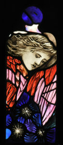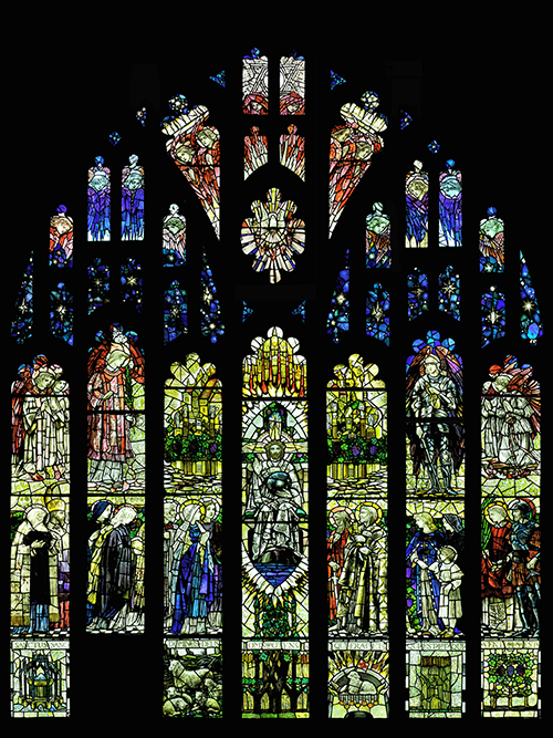St. Mark’s Church, connected to the local St. John the Evangelist Church in Birkenhead was built in 1891, and became a separate parish in 1922. By 1991 it had closed, and the valued “Father Willis” organ transported to a new home in Leiden Cathedral in the Netherlands. The superb East Window, made in 1906 by celebrated Arts & Crafts stained glass artist Christopher Whall (1849-1924) was also saved from demolition, and put in storage at a private stained glass company in Weston Super Mare. Its storage was monitored by Arts and Crafts period expert and historian Peter Cormack, and under his supervision the window was transported to its current home, the Stained Glass Repository; a charitable trust that seeks to rescue good quality glass, and find an alternative home for it. This 7-light window, saved in its entirety apart from one missing bottom row panel, depicts Christ Enthroned with Angels and Saints. Whall’s distinctive style is demonstrated; and this is rightly considered to be among his masterpieces.