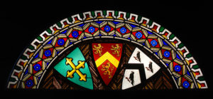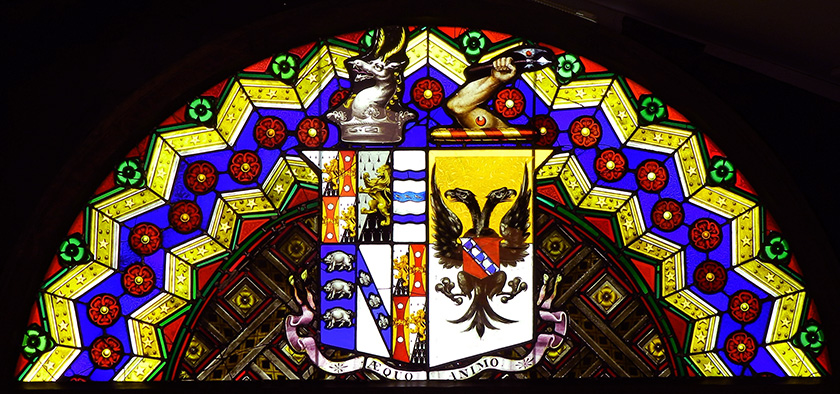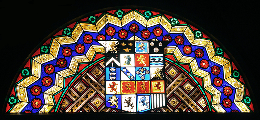 Originally a fortified manor house, founded in 1438, Penrhyn Castle is largely reconstructed, and the present building dates from 1822-1837. The splendid lunettes from the Great Hall and Library, are by Francis Eginton (1787-1805), a significant artist the field of painting in glass paint and enamels at the time. His other projects include a large lunette at Stourhead House Library, and a window at St. Alkmund’s Church, Shrewsbury. The Penrhyn Castle lunettes are brightly coloured, with vivid patterns, and contain heraldic devices. These windows are notable for the use of splendid red silver stain on kelp glass. Before conservation the Penrhyn Castle panels were severely bowed and unstable, with resulting cracks to many pieces of glass. Re-leading was necessary to provide support for these structurally compromised panels. This involved custom milling of very narrow leads to accommodate the very thin glass.